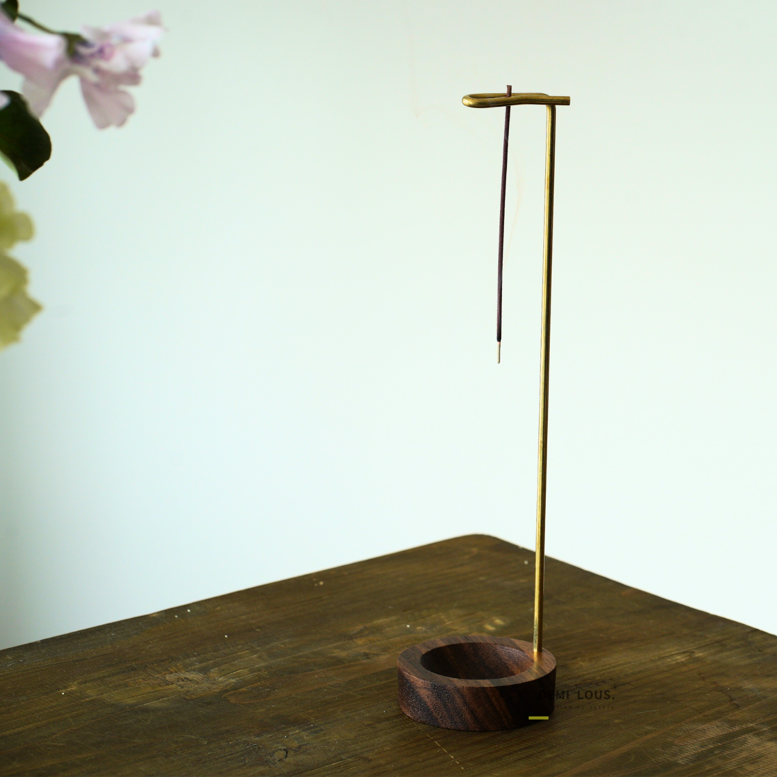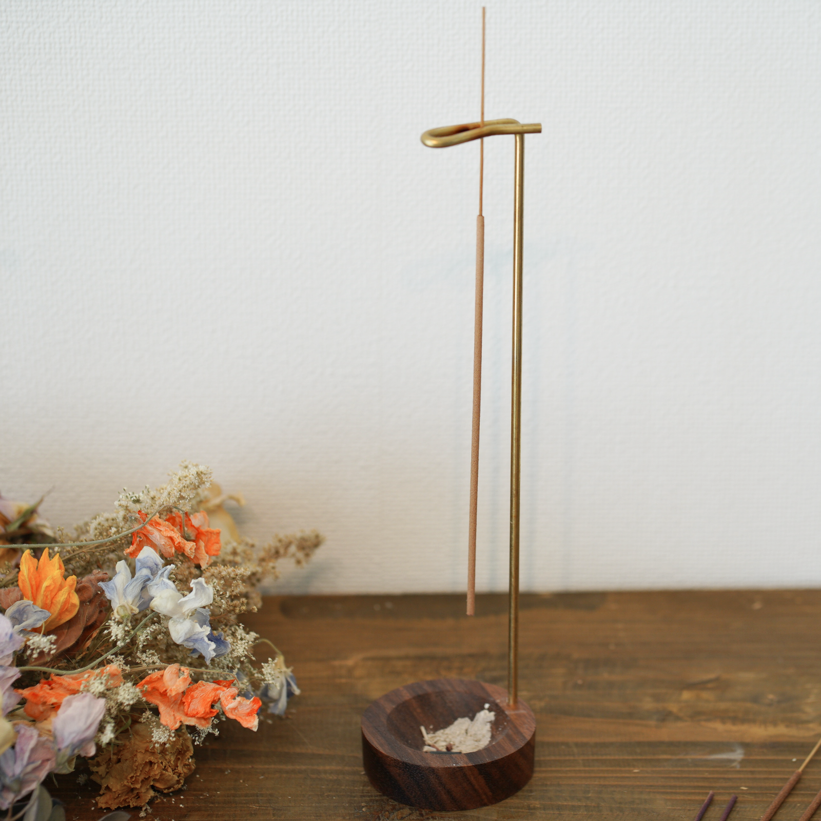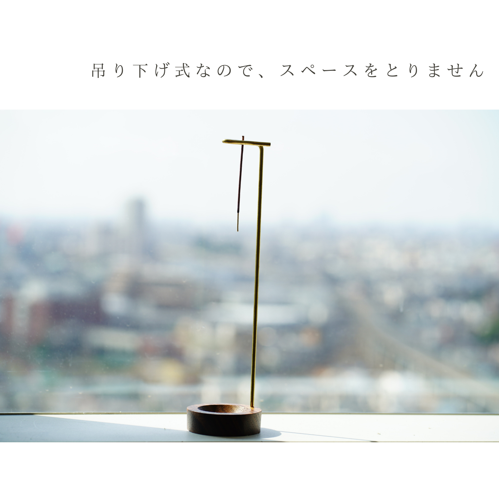 吊り下げ式線香立てはおしゃれなデザインで場所をとらず、線香の灰が真下の受け皿に落ちるので掃除も簡単。真鍮と木製受け皿の高級感がスタイリッシュ。線香は最後まで燃焼するので、安心して楽しめるインテリアにぴったりな商品です。